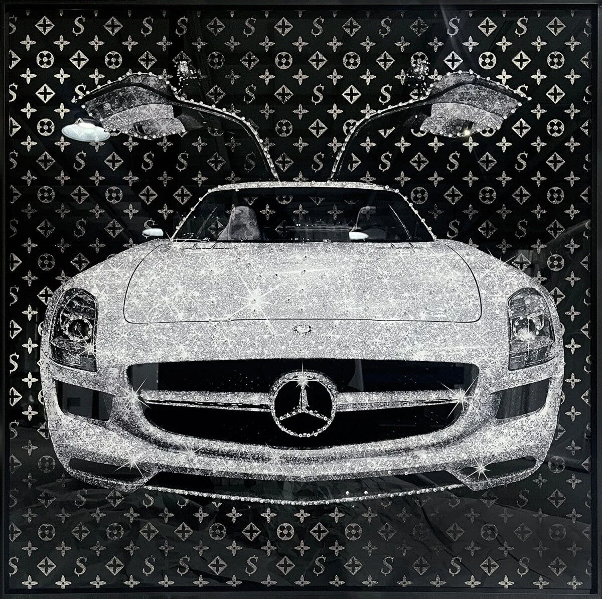 Glasschilderij met kristallen en lijst 80x80cm Auto met vliegdeuren